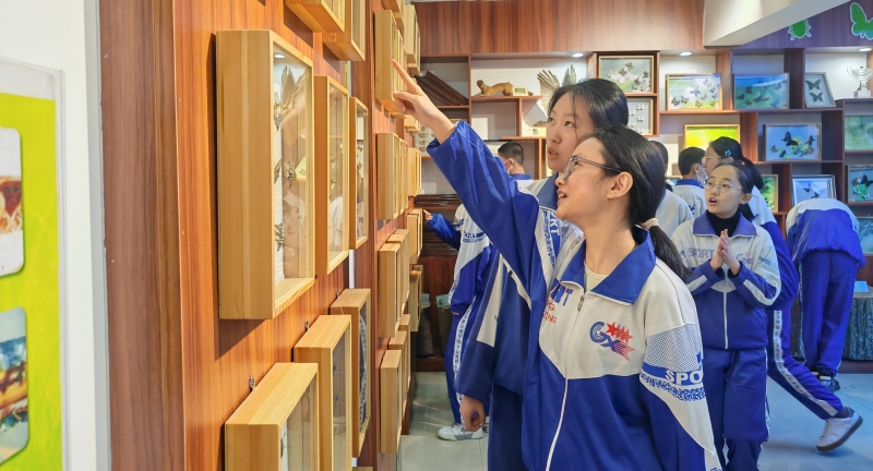 “接下來我們看到的是蝶類和蛾類,他們需要經歷卵、幼蟲、蛹、成蟲四個階段?!痹陂L白山生物標本室,講解員向學生們介紹了標本室的歷史,昆蟲種類和數(shù)目、標本的采集地等相關知識。學生們通過零距離的接觸,被種類繁多、栩栩如生的各式標本深深吸引。